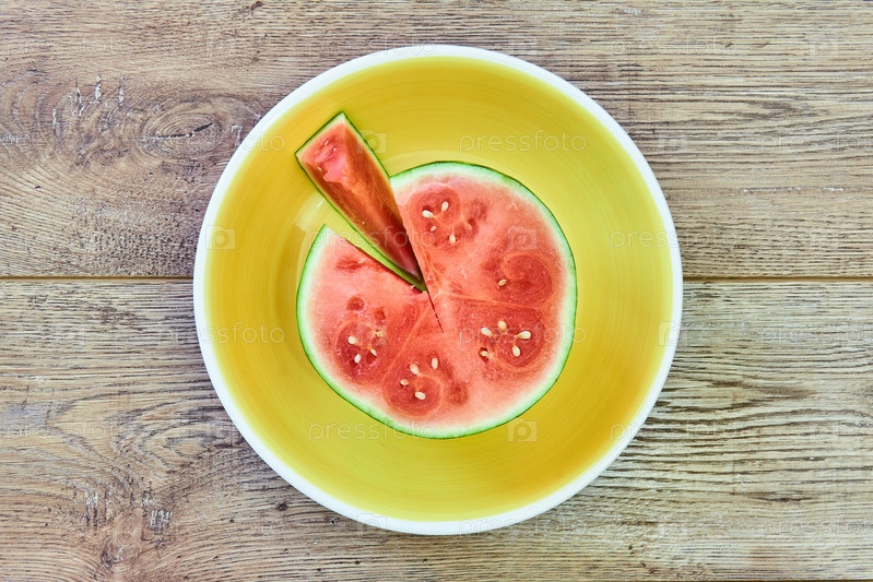 Маленький спелый разрезанный арбуз на зеленой тарелке на деревянном столе