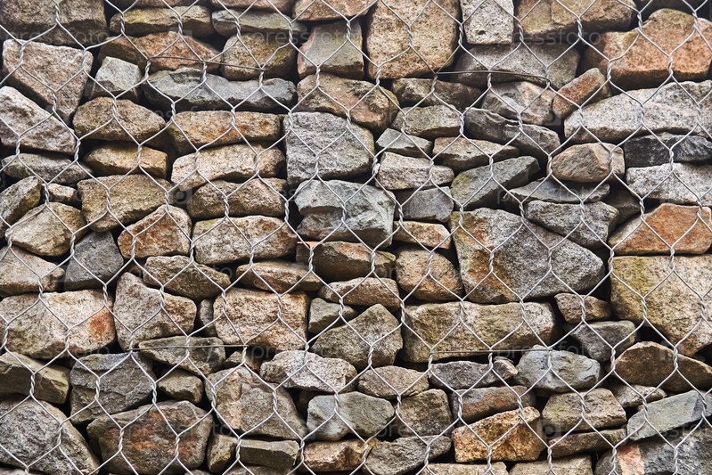 Фон - габионная стена из проволочной сетки с гранитными валунами