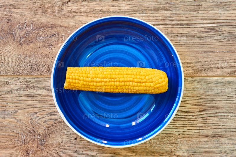 Желтый початок вареной кукурузы, синяя тарелка на деревянном столе