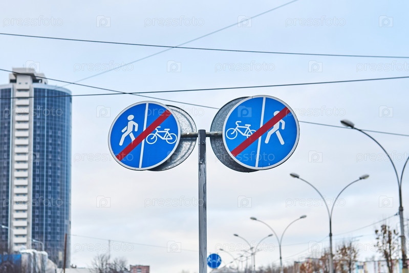 Дорожный знак «конец участка с движением только для пешеходов и велосипедов» на фоне облачного неба