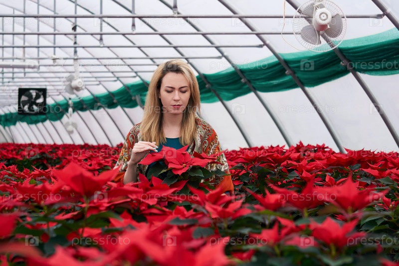 Молодая женщина смотрит на красные цветы пуансеттии в интерьере теплицы в зимний день