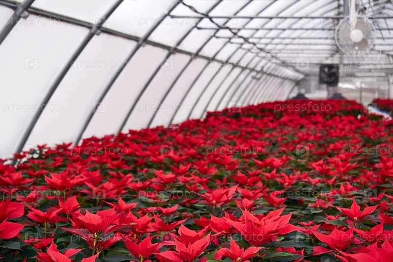 Растительный питомник с множеством красных цветов пуансеттии в теплице
