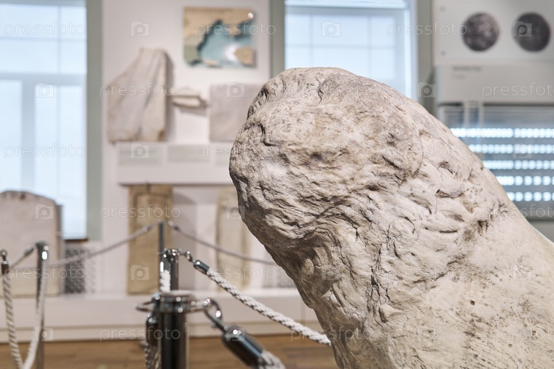 Голова разрушенной античной статуи льва в экспозиции исторического музея