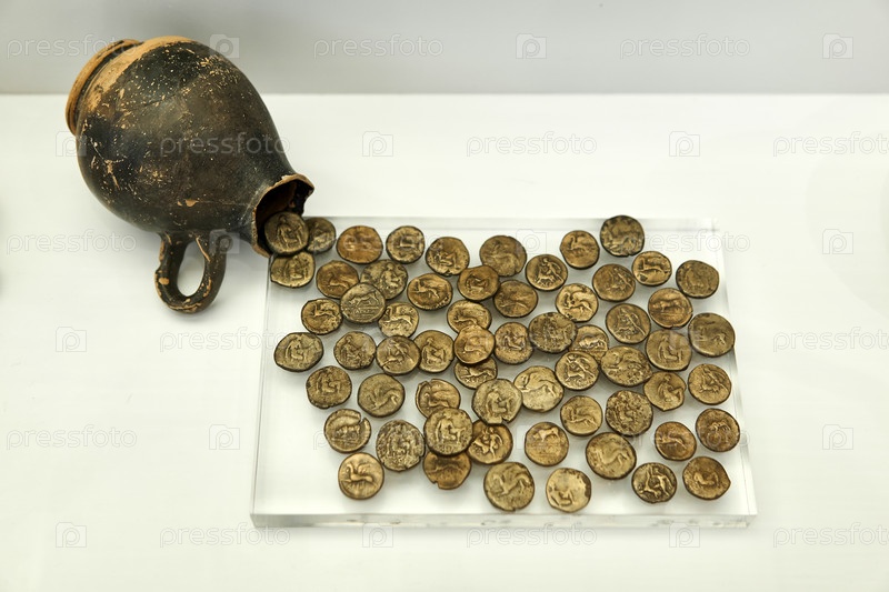 Древнегреческое монетное сокровище III века до н. э. в кувшине в экспозиции музея Херсонес, Крым