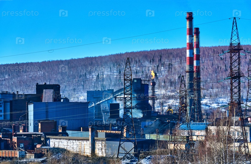 Индустриальный пейзаж - факел коксохимического завода производит тепловые выбросы в атмосферу