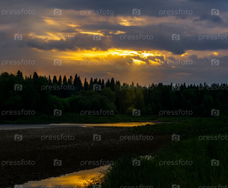 Летний закат над северной рекой с лесистыми берегами