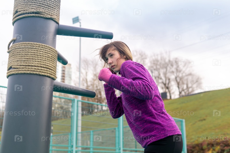 Молодая женщина тренируется в единоборствах одна на спортивной площадке с традиционными манекенами