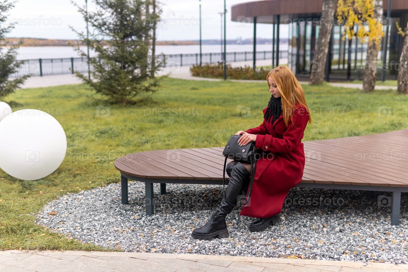 Рыжая девушка, гуляя по осеннему парку, села на скамейку, чтобы заглянуть в свою сумочку