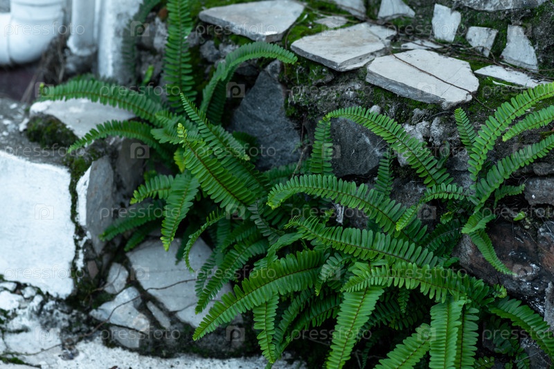 Красивые папоротники растут в расщелинах старой каменной лестницы