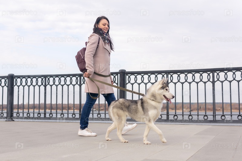 Молодая женщина с хаски-собакой гуляет по набережной в осенний день