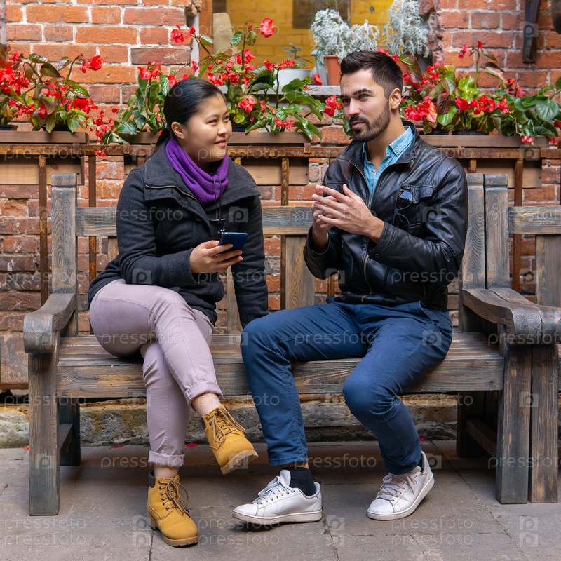 Европейский молодой человек разговаривает с азиатской девушкой, держащей смартфон