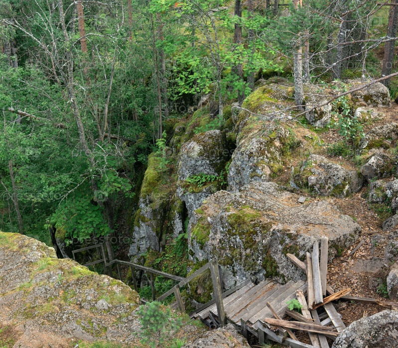 Разрушенная деревянная лестница на заброшенной тропе в горном лесу