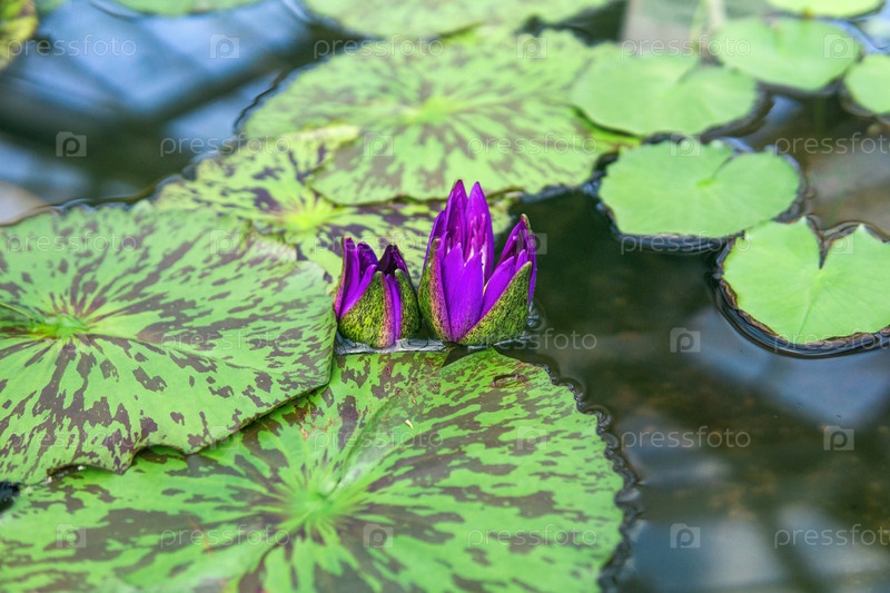 Фиолетовые бутоны тропической кувшинки перед цветением в тепличном бассейне