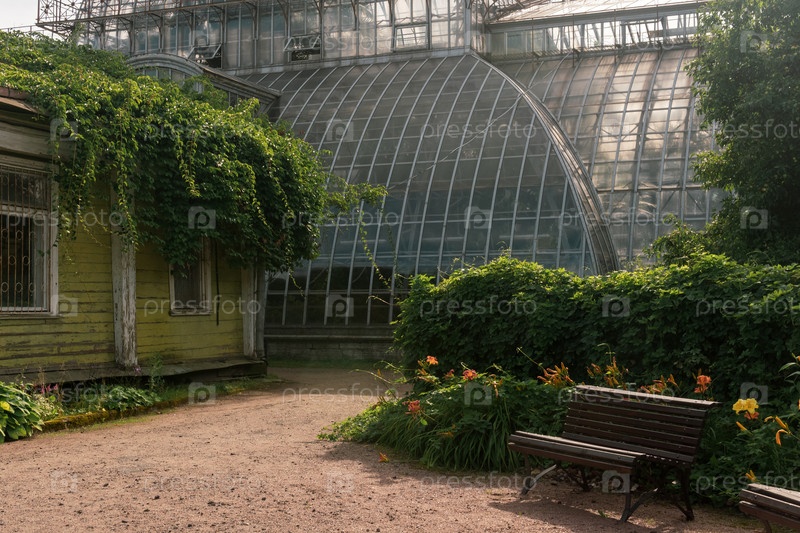 Уголок старого ботанического сада с огромной старинной оранжереей на заднем плане