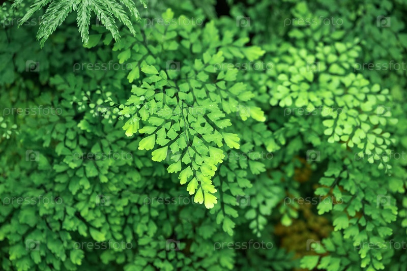 Цветочный частично размытый фон с тропическими папоротниками в естественной среде обитания