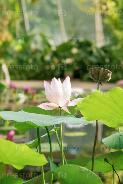 Красивый нежный бело-розовый цветок лотоса в естественной среде обитания крупным планом