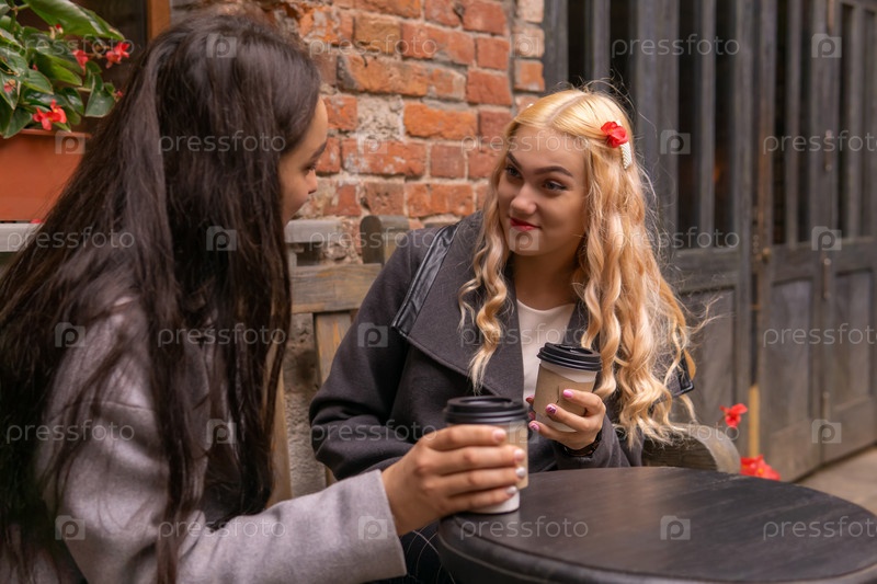 Девушка с удивлением слушает свою подругу на скамейке с кофе на открытом воздухе