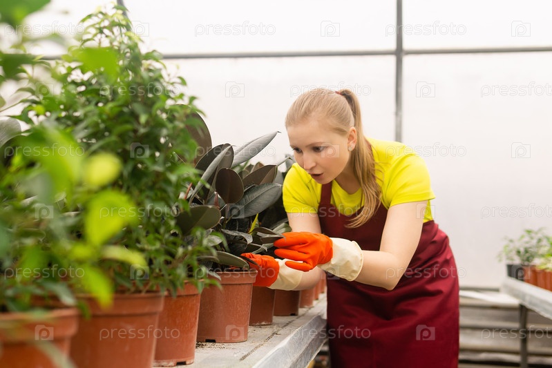 Женщина-садовник осматривает декоративные растения в зимнем саду