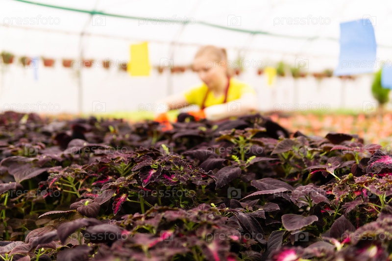 Размытая женщина-флорист ухаживает за декоративными растениями в зимнем саду