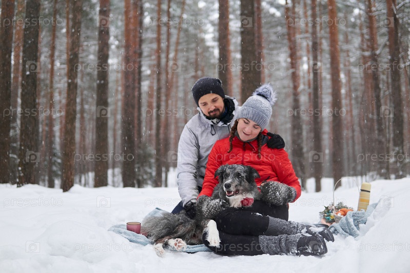 Молодая пара с собакой устраивают пикник в заснеженном лесу