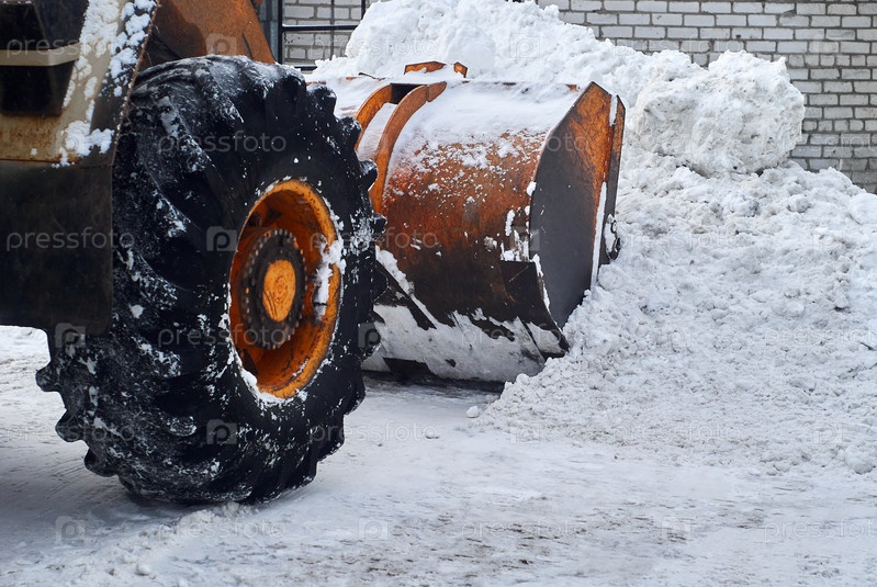 Ковш-погрузчик убирает сугроб крупным планом