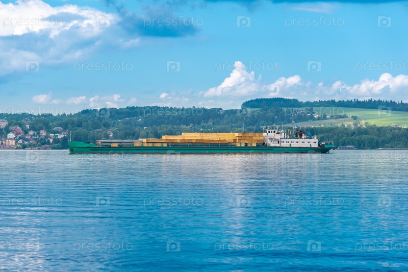 Грузовой корабль с лесом следует по широкой реке в солнечный день