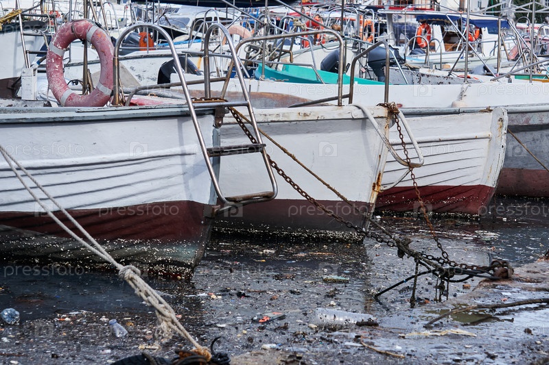 Загрязнение окружающей среды - мусор на поверхности воды между пришвартованными кораблями в гавани
