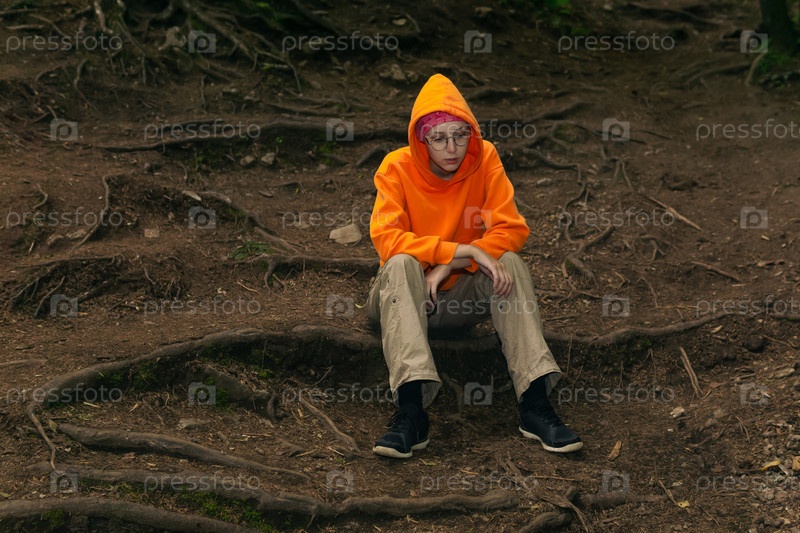 Грустная девочка-подросток в толстовке сидит на естественном фоне