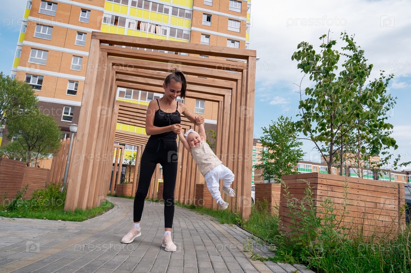 Мама и ребенок гуляют и играют в городском дворе