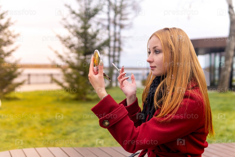 Рыжая девушка обновляет макияж во время прогулки по осеннему парку