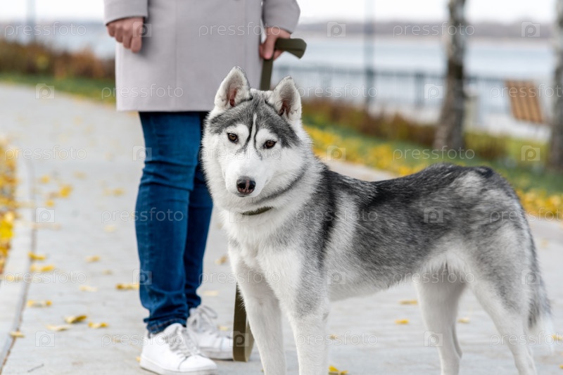 Хаски-собака гуляет с хозяином в городском парке осенним днем