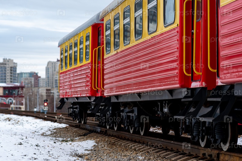 Пассажирский поезд на узкоколейной железной дороге на фоне города