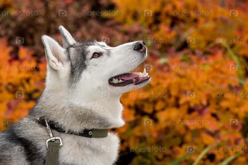 Портрет хаски на фоне оранжевой листвы