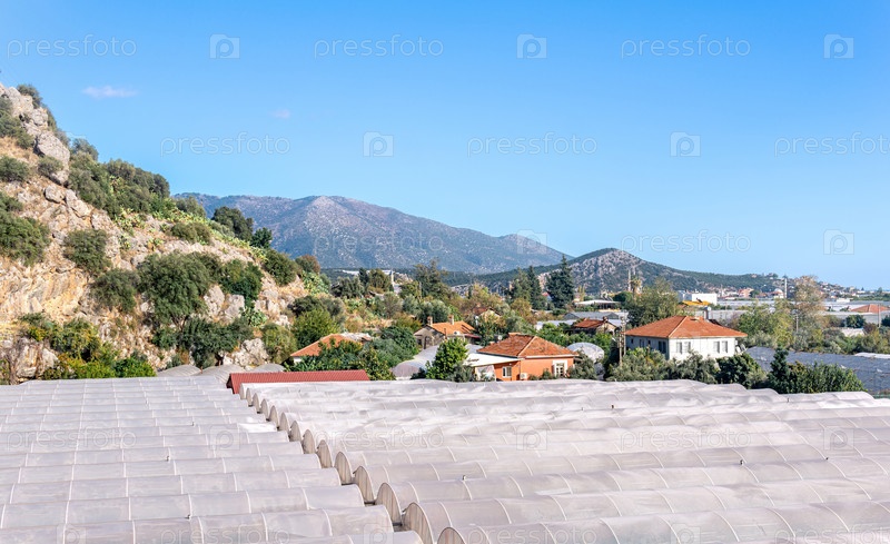 Вид на город Демре на юге Турции с сельскохозяйственными политоннелями среди гор