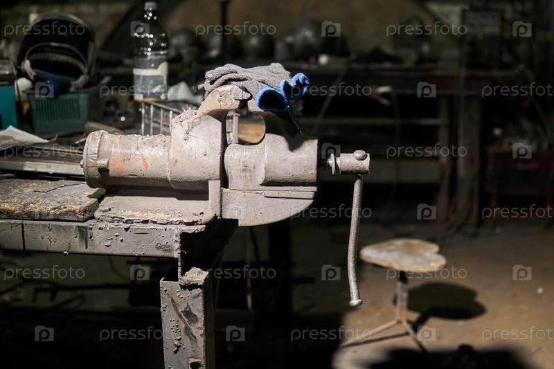 Тиски в старой мастерской; ремесленник куда-то ушел