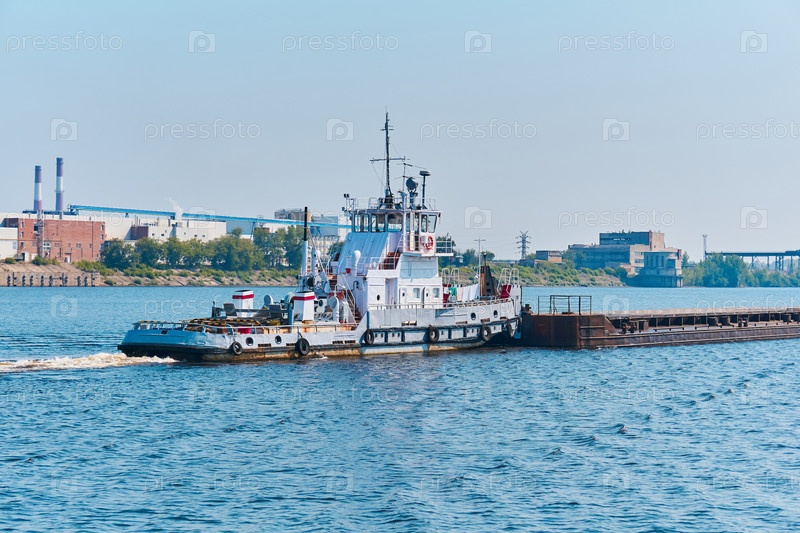 Буксир толкает баржу с сыпучими грузами по реке в промышленном ландшафте