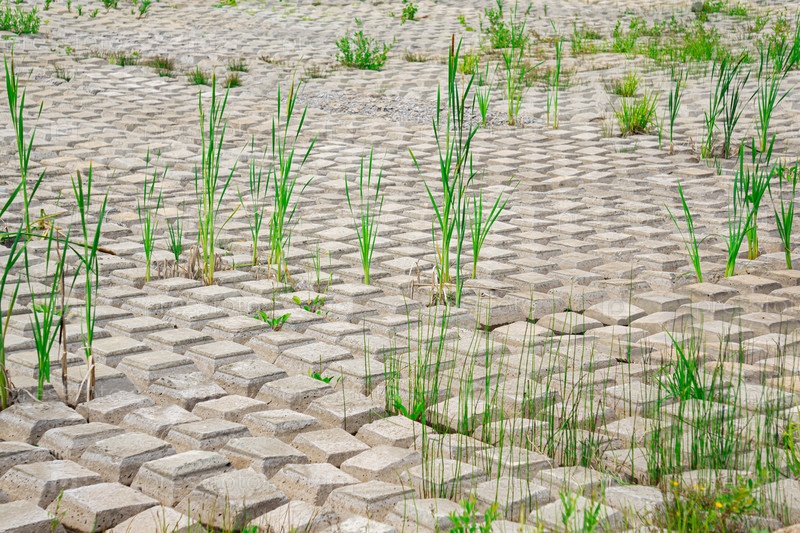 Участок, покрытый гибким бетонным матом для предотвращения эрозии, уложенный на землю, сквозь который растут растения