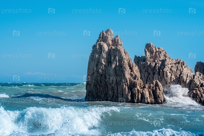 Морские прибрежные скалы среди прибоя в ветреный солнечный день