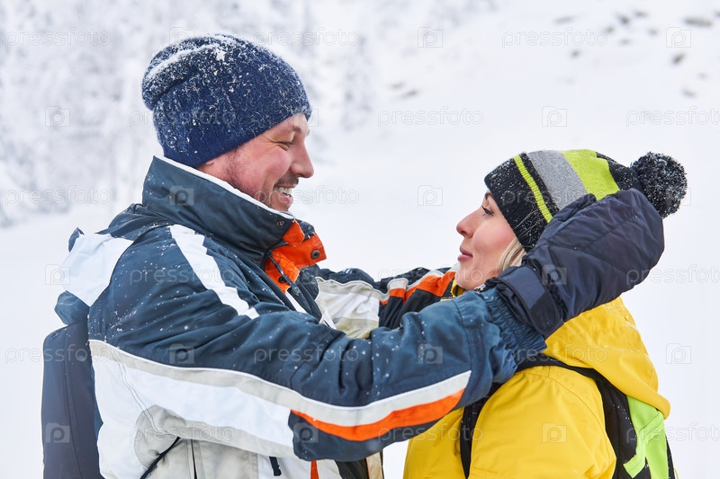 Пара путешественников смотрят друг на друга, обнимаясь на фоне размытого зимнего пейзажа