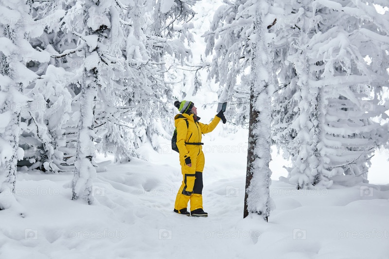 Женщина-путешественница в зимнем лесу записывает видео на смартфон