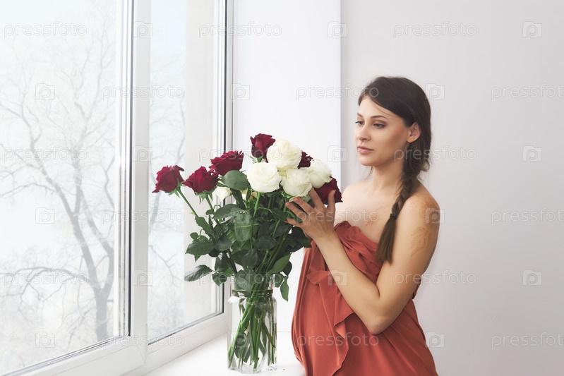 Беременная женщина стоит у окна рядом с букетом роз в вазе