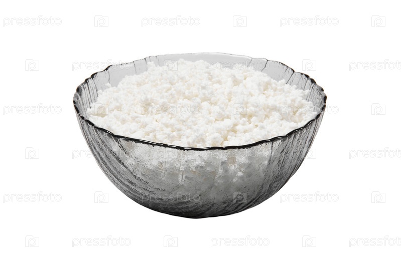 Стеклянная миска с творогом на белом фоне