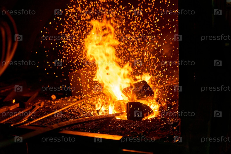 Кузнечная печь с горящим огнем и ковочными инструментами, лежащими рядом