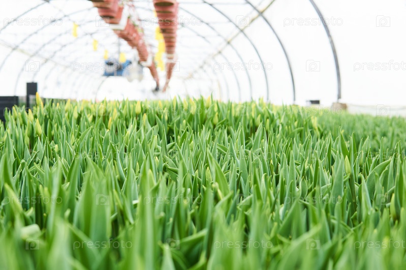 Размытый интерьер промышленной теплицы, в которой выращивают тюльпаны, сосредоточьтесь на близлежащих растениях