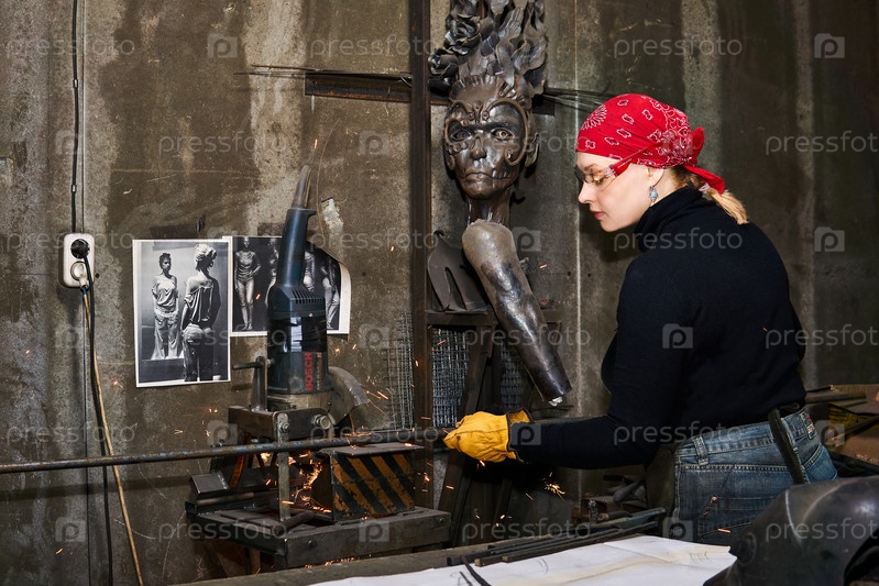 Женщина-художница по металлу за работой в мастерской с помощью пилы по металлу