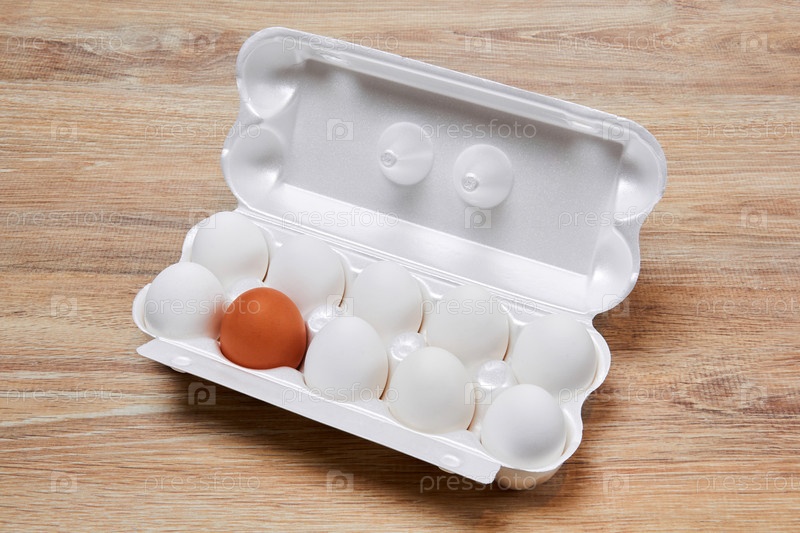 Ящик для яиц с девятью белыми яйцами и одним коричневым на поверхности деревянного стола