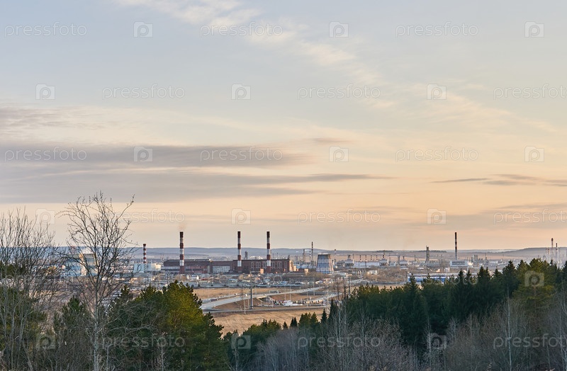Промышленный пейзаж ранней весной с электростанцией в долине