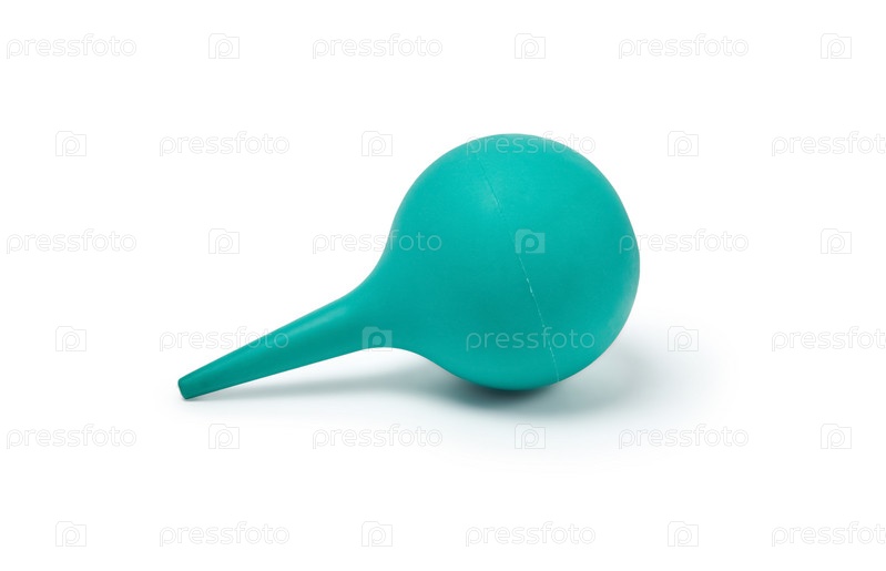 Шприц с зеленой резиновой грушей на белом фоне