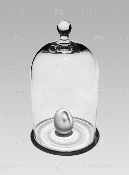 Яйцо чувствует себя защищенным под стеклянной крышкой на светлом фоне, монохромное фото