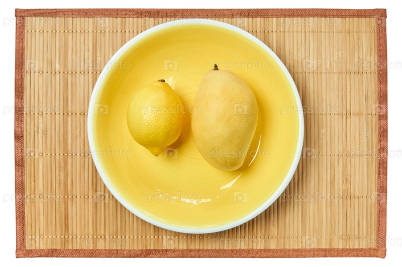 Яркий лимон и бледное манго на желтой тарелке на тростниковой скатерти